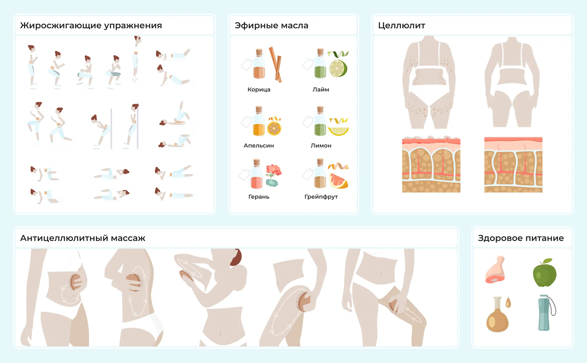 Целлюлит – это не приговор! С ним можно успешно бороться, если подходить к проблеме комплексно: улучшать питание, активизировать кровообращение, поддерживать организм изнутри и сохранять физическую активность.