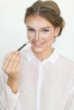 Шаг 2. Корректируем форму носа. Затемняем боковые части носа от его основания до кончика с помощью корректора. Линии должны быть прямыми и не заходить на ноздри. Чтобы визуально удлинить нос, начинайте рисовать линии от бровей.