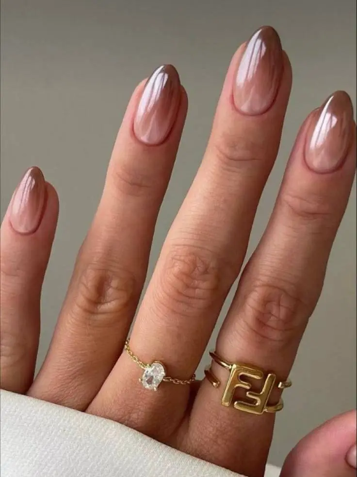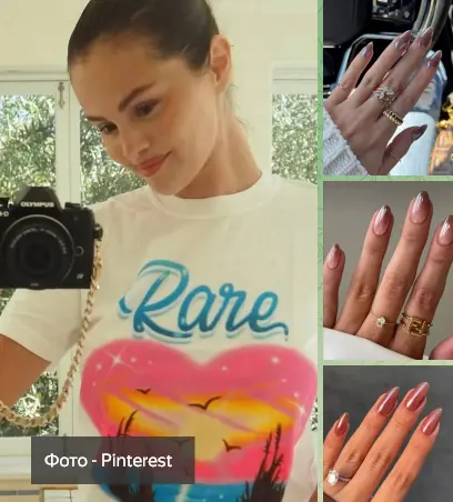 Toasted manicure – это маникюр в тёплых карамельных и молочных оттенках с легким сатиновым блеском, напоминающим поджаренный тост. Этот стиль стал популярным благодаря Селене Гомес. Мягкий перламутр и тёплая палитра создают эффект естественного свечения.