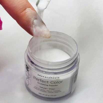 - С помощью акриловой пудры посыпьте ноготь, держа его над баночкой, чтобы пудра впиталась в основание. Просушите 1 минуту.