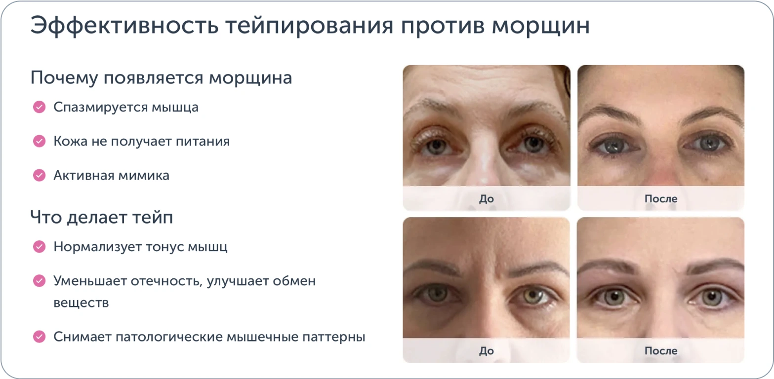 Многие мимические морщины со временем становятся постоянными, особенно в областях с ярко выраженной мимикой, даже если она неосознанная. При наложении тейпов они слегка натягивают кожу, фиксируя определенные участки. Это снижает активность мимических мышц, особенно тех, которые проявляются чаще всего, как на лбу или в области глаз. В результате мышцы начинают меньше напрягаться, что уменьшает привычные складки на коже. Эффект временного разглаживания морщин становится заметен, и лицо выглядит более расслабленным. Это также позволяет коже и мышцам максимально восстановиться во сне.