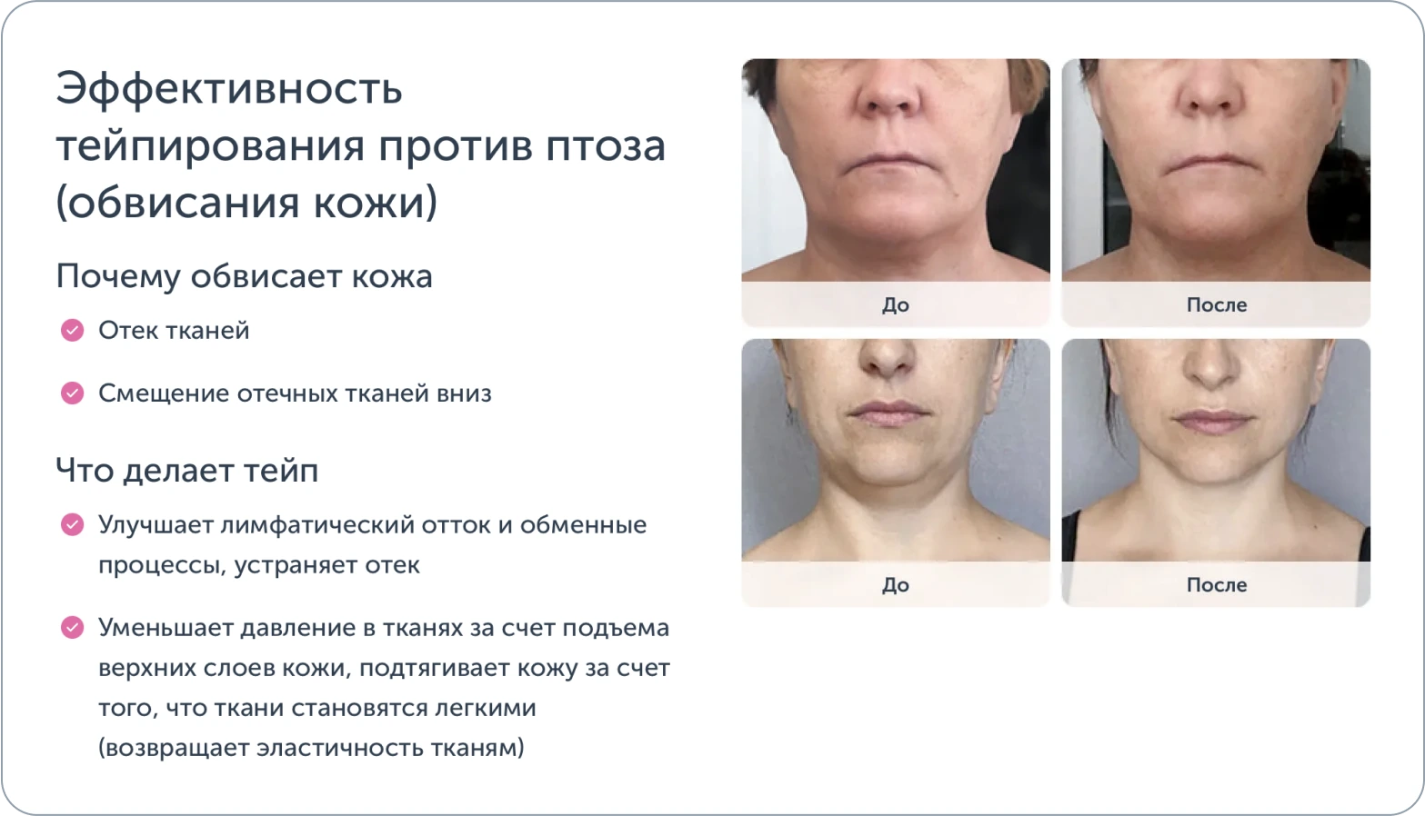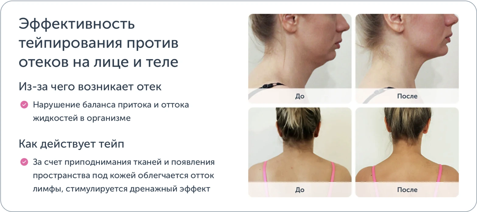 Помимо этого, это способствует выведению токсинов и снижению застойных явлений в тканях. Лимфодренажное тейпирование способствует устранению припухлостей и придаёт лицу более свежий вид.