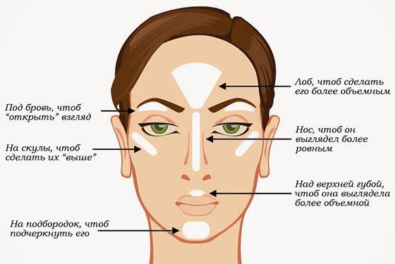 - Скулы. Высветление выступающих частей создает эффект молодости и подтянутости.