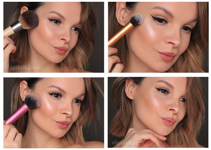 - Теплые — бронзер или персиковые румяна, гармонирующие с вашим загаром.