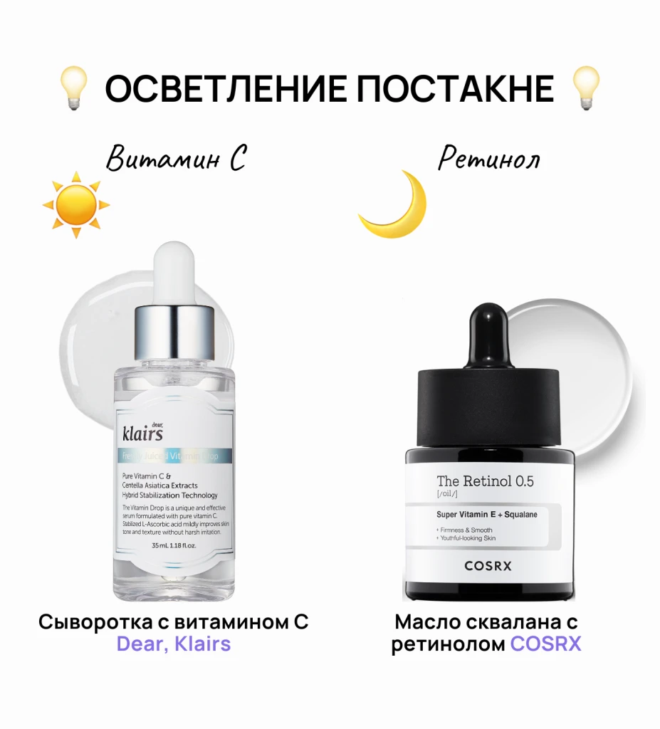 В качестве рекомендации лучше использовать витамин С утром, а ретинол — по вечерам.