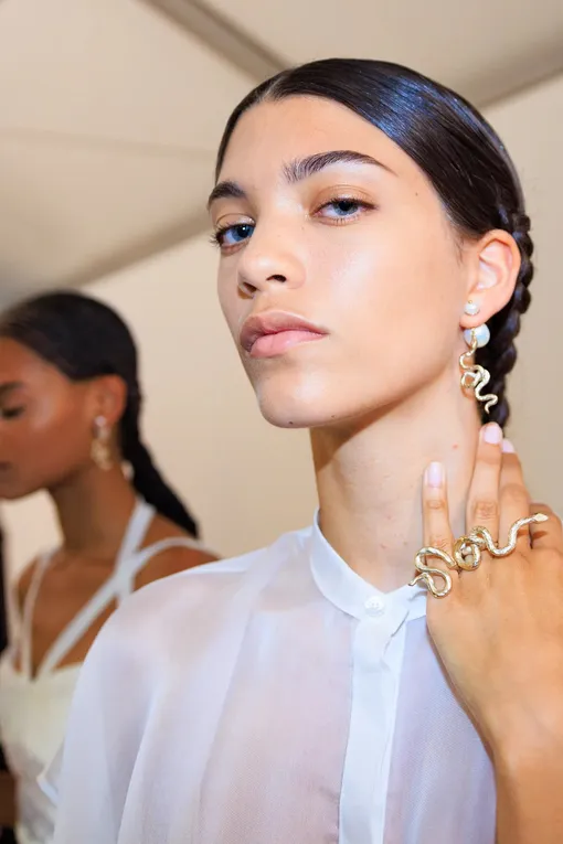 Макияж моделей от Schiaparelli — отличный выбор для повседневного использования. Кожа должна быть хорошо увлажнена, с идеальным тоном (для этого рекомендуем лёгкую основа с немного влажным финишем), и щедро украшена хайлайтером. Пэт раскладывала его на скулы, нос и подбородок, а В уголках глаз и на верхней губе. Этот стиль фешн-журналисты быстро назвали «стеклянная кожа», хотя многие согласились, что такое название больше подошло другому показу — коллекции Джона Гальяно для Maison Margiela.
