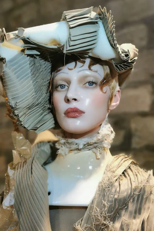 Dior Haute Couture весна-лето 2024. Дуэт Гальяно и Пэт МакГрат всегда создавал уникальные образы. В этот раз их сотрудничество пополнилось «образом фарфоровых кукол»: МакГрат и её команда осветлили лица моделей, применили яркий кукольный макияж, а затем нанесли несколько слоёв маски-пленки с помощью аэрографа. Конечно, такую технику сложно адаптировать для повседневной жизни, но можно создать макияж, вдохновленный этим стилем, используя много хайлайтера.