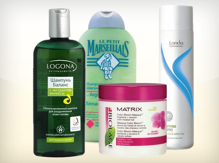 Шампунь для «жирных» волос «Баланс» от Logona с экстрактом мелиссы. Маска для окрашенных волос Biolage Color Care Therapie Color Bloom Mask от Matrix без силиконов и парабенов. Очищающий шампунь Purifying Shampoo от Londa Professional на основе экстракта чая.