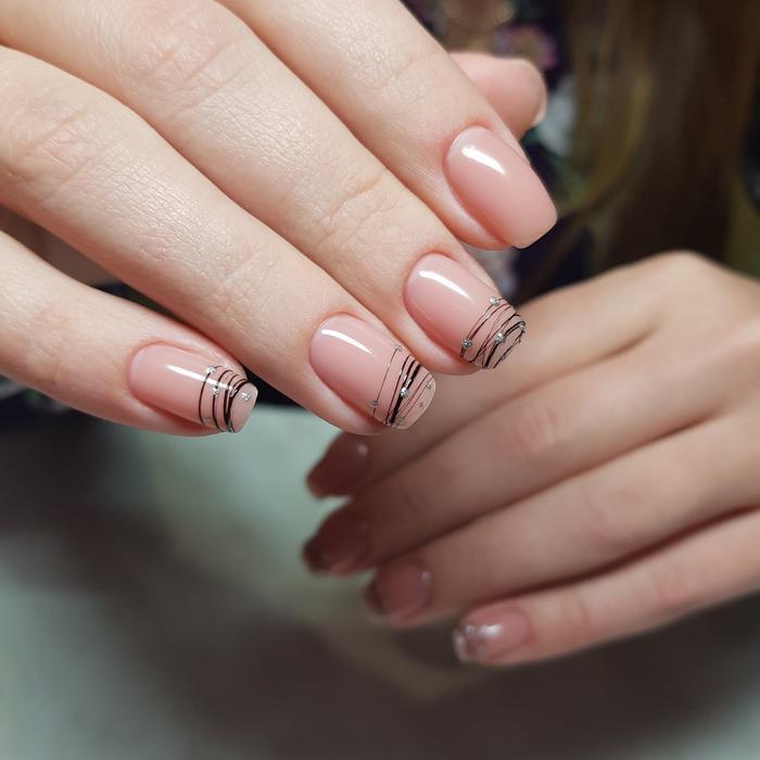 Такой маникюр великолепен сам по себе, но если хотите что-то добавить, можно рассмотреть минималистичные рисунки – точечки или тонкие линии, графику. Можно украсить только несколько ногтей, а если ваша ногтевая пластина ослаблена, выберите лечебный лак с розоватым или молочным тональным оттенком.