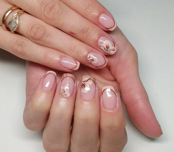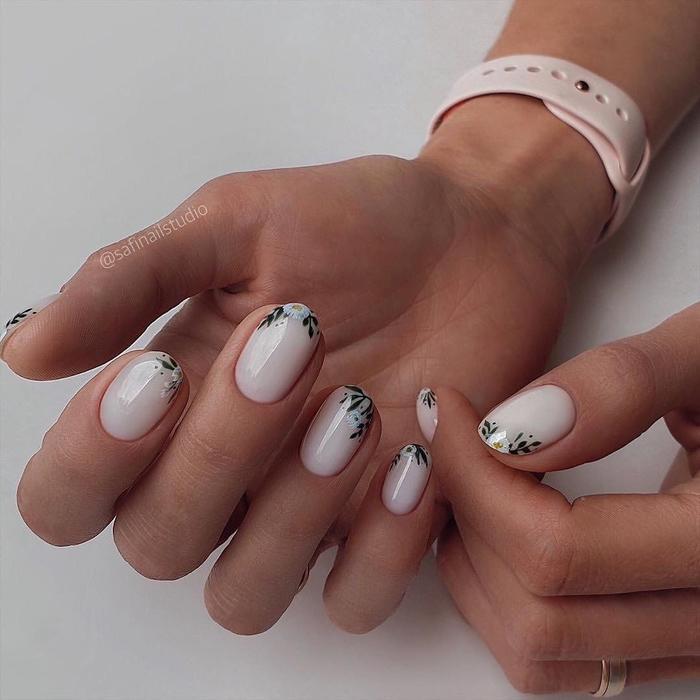 Нежный молочный дизайн с цветочным мотивом вместо линии улыбки – превосходный выбор для летнего образа.