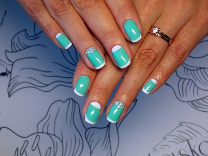 Давайте немного отступим от традиций и полюбуемся стильным цветным френчем. Он смотрится великолепно, не так ли? Яркие бирюзовые оттенки идеально подходят для летнего сезона и морского отдыха.