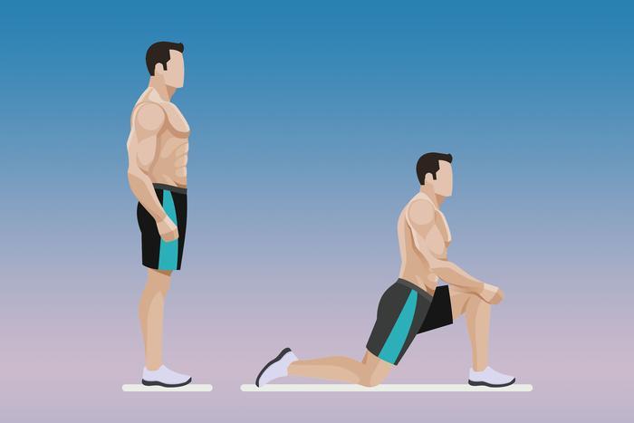 - Сделайте выпад вперед и опустите заднее колено на пол. Держите корпус вертикально, слегка подкручивая таз вперед (представьте, что хотите прижать поясницу к полу).
