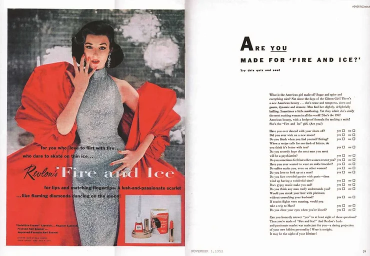 Такие бренды, как Хейзел Бишоп, внедряли новые формулы, которые не оставляли следов на губах, и использовали телевидение для продвижения своей продукции. Красная помада стала неотъемлемой частью образа множества известных женщин того времени, среди которых были Мэрилин Монро и Элизабет Тейлор.