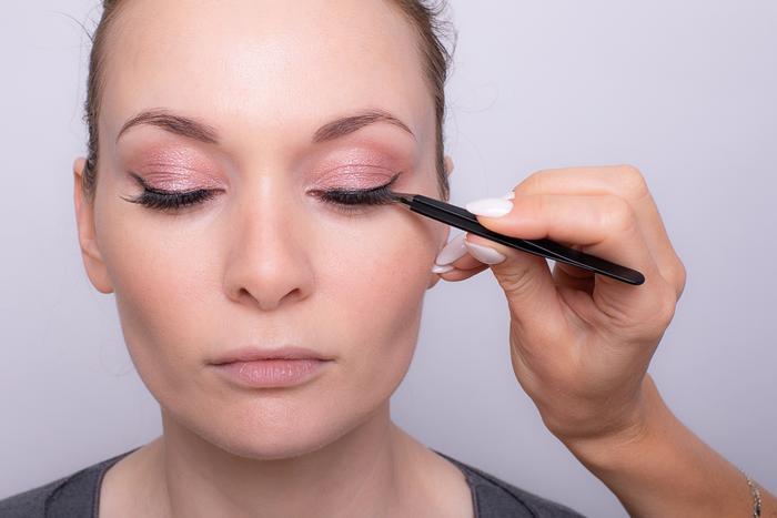 Перед приклеиванием ленты я поднимаю собственные ресницы Карины в углах, чтобы они не выглядывали из-под накладных.