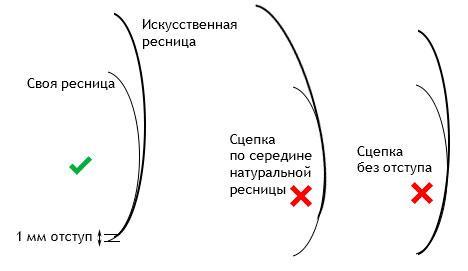 - Отступайте! Отступ между ресницами при любом объеме должен составлять от 0,5 до 1 миллиметра! Отступ должен быть равномерным по всему веку (особенно в уголках). Искусственная ресница не должна касаться кожи века!