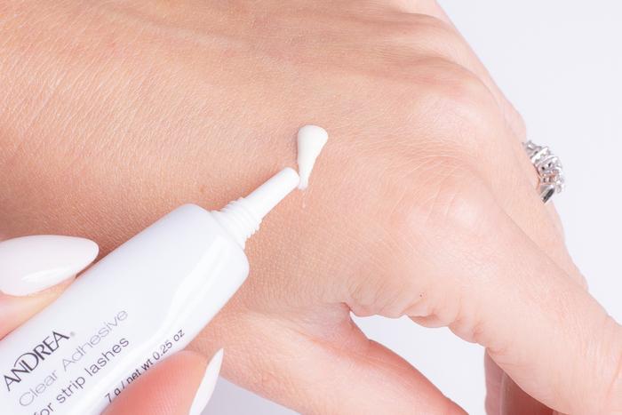 Для ленточных ресниц мне нравится использовать клей Duo. Он имеет более длительное время схватывания, что позволяет подкорректировать её положение и удобно зафиксировать в соответствии с формой глаза.