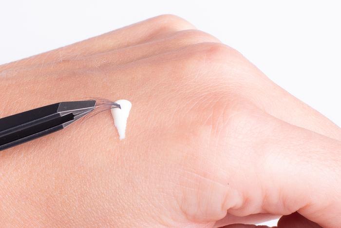 Переверните пинцет и аккуратно окуните основание пучка в клей. Достаточно совсем немного.